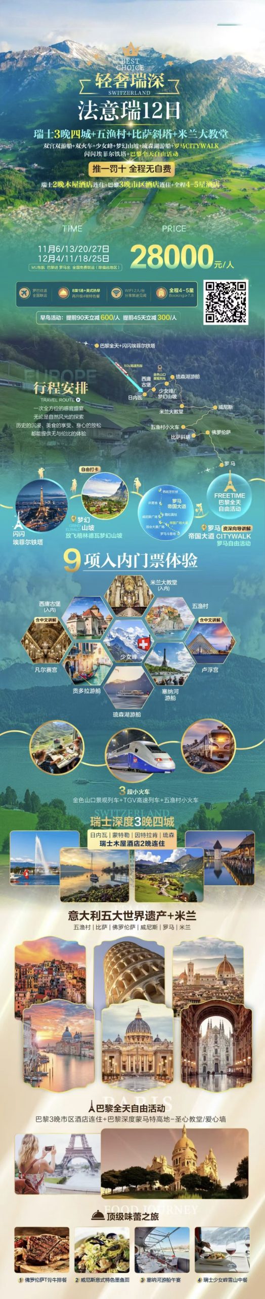🌐🍎瑞深轻奢🫧法意瑞+米渔萨12天 🦅东航/国航巴罗往返,🉑全国联运