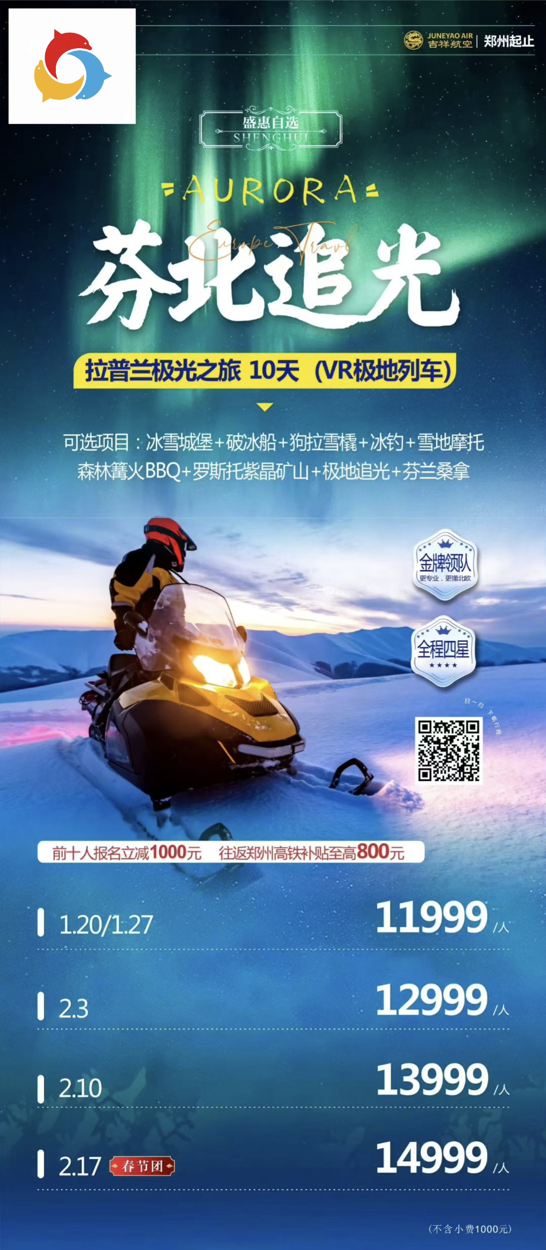 【盛惠自选】HO-郑州-10天-芬兰一地拉普兰追光之旅