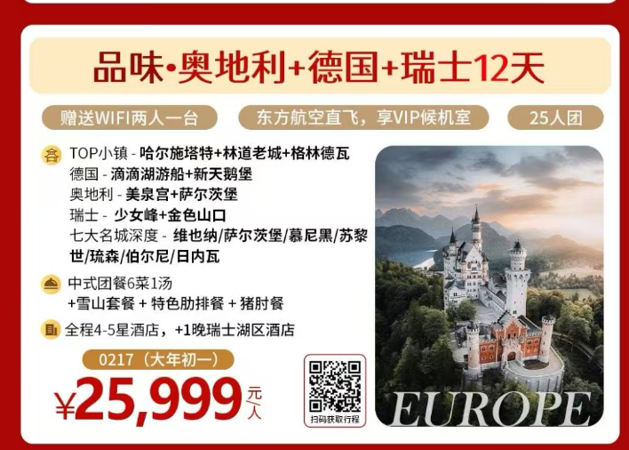 品味·法意瑞+少女峰+金色山口12天 赠送WIFI两人一台 东方航空直飞,享VIP候机室 25人团